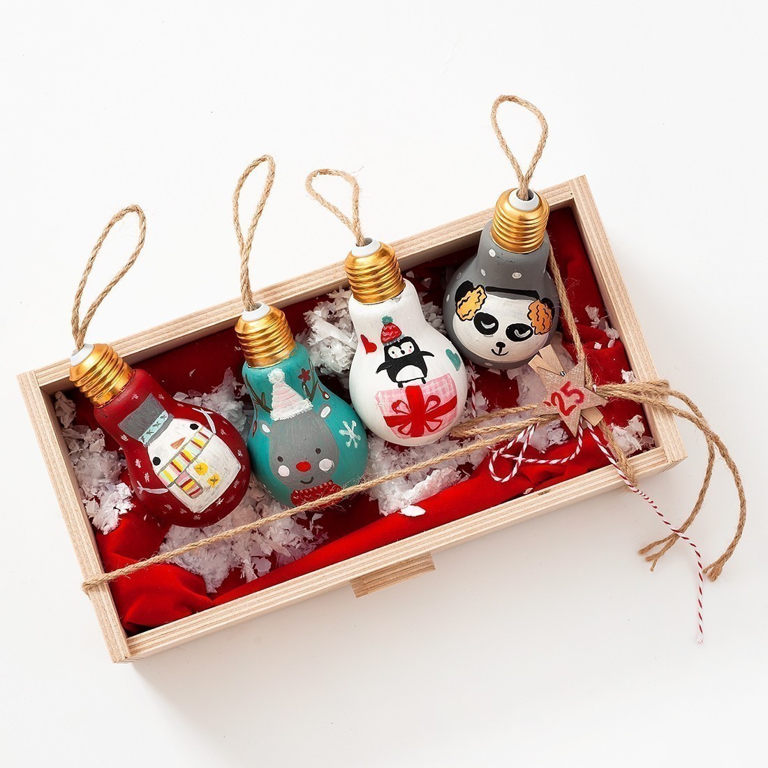 Χριστουγεννιάτικο σετ δώρου σε ξύλινο κουτί με plexiglass. Μέσα περιλαμβάνει 4 ζωγραφιστές Χριστουγεννιάτικες μπάλες σε σχήμα λάμπας (panda, χιονάνθρωπος, τάρανδος και πιγκουΐνος). Εξωτερικά είναι διακοσμημένο με ξύλινο μανταλάκι αστεράκι και κορδόνια.