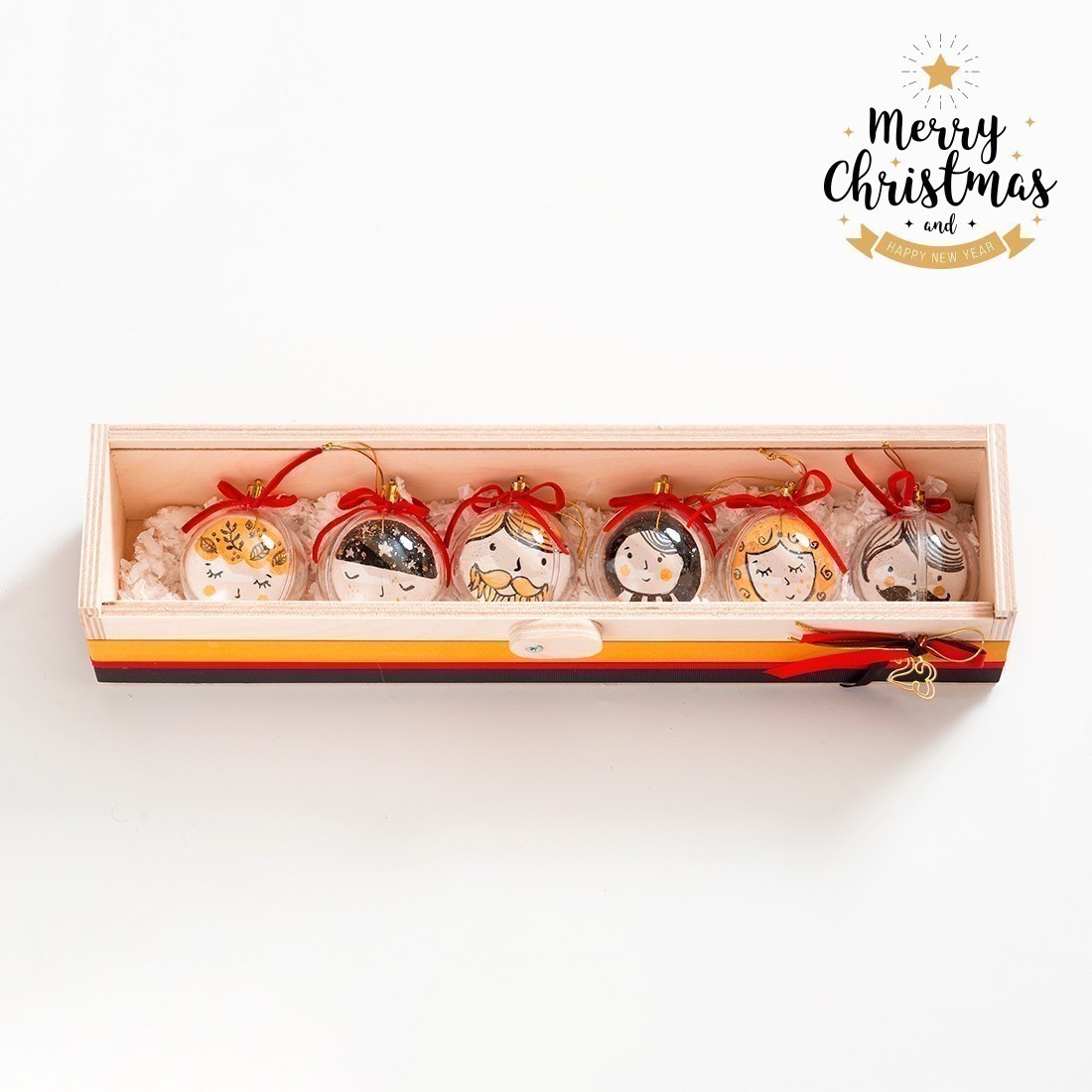 Χριστουγεννιάτικο σετ δώρου σε ξύλινο κουτί με plexiglass. Μέσα περιλαμβάνει 6 πλαστικές μπάλες με κεραμικά The Christmas family. Εξωτερικά είναι διακοσμημένο με μεταλλικό στοιχείο και ασορτί κορδέλες.