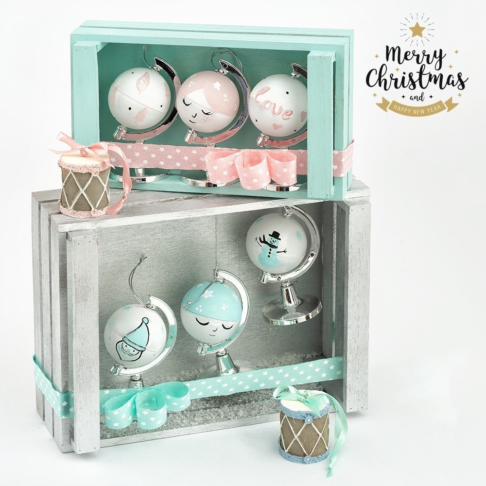 Σετ με Χριστουγεννιάτικες μπάλες. Περιλαμβάνει 2 καφάσια σε ασημί και βεραμάν χρώμα με 6 ζωγραφιστές υδρόγειες σφαίρες και 2 πολυεστερικά τύμπανα.