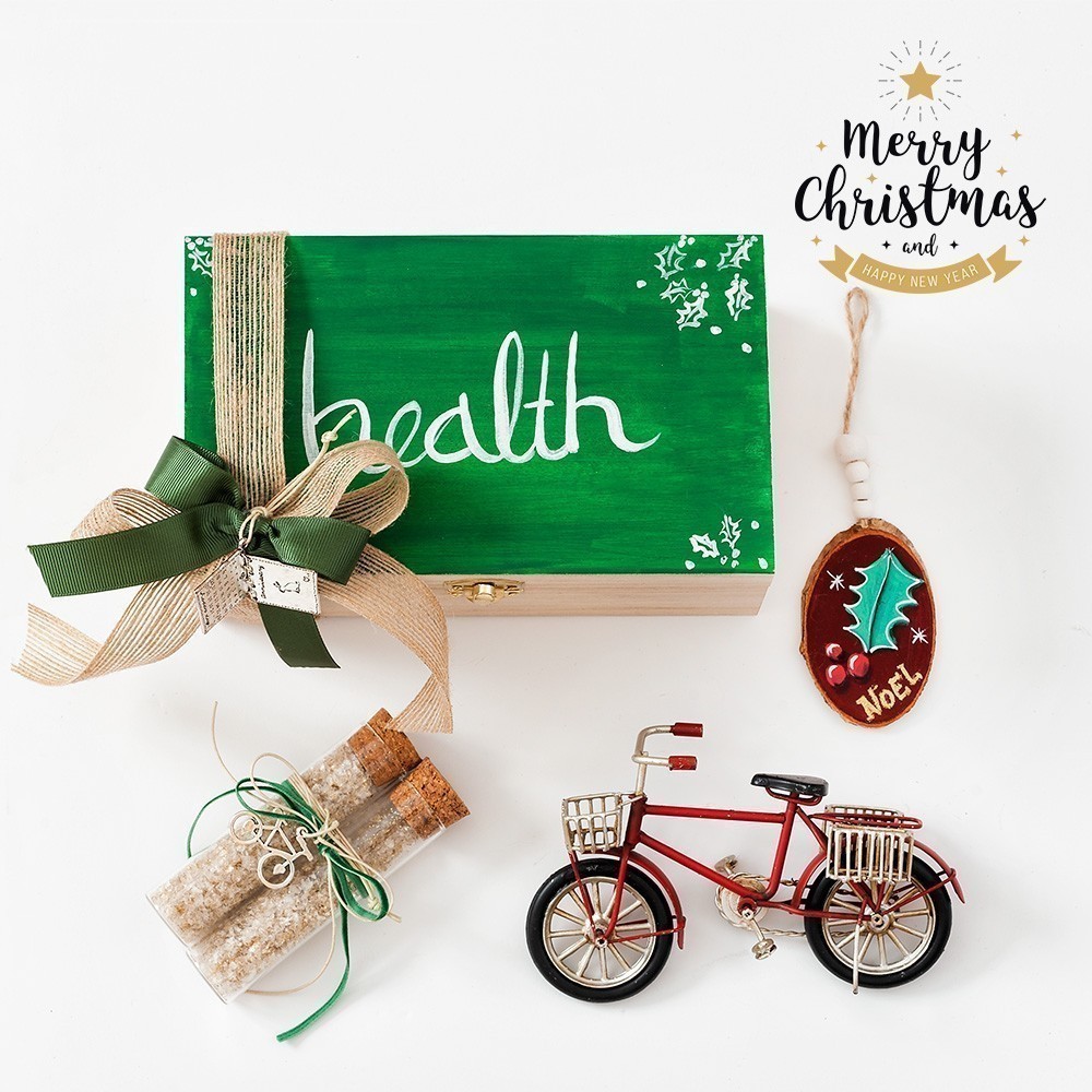 Χριστουγεννιάτικο σετ δώρου σε ξύλινο κουτί. Το καπάκι είναι ζωγραφισμένο σε πράσινο χρώμα με τη φράση Health. Μέσα περιλαμβάνει μεταλλική αντίκα ποδήλατο, ξύλινο κρεμαστό ζωγραφιστό κορμό και δυο γυάλινους σωλήνες με μεταλλικό ποδήλατο.