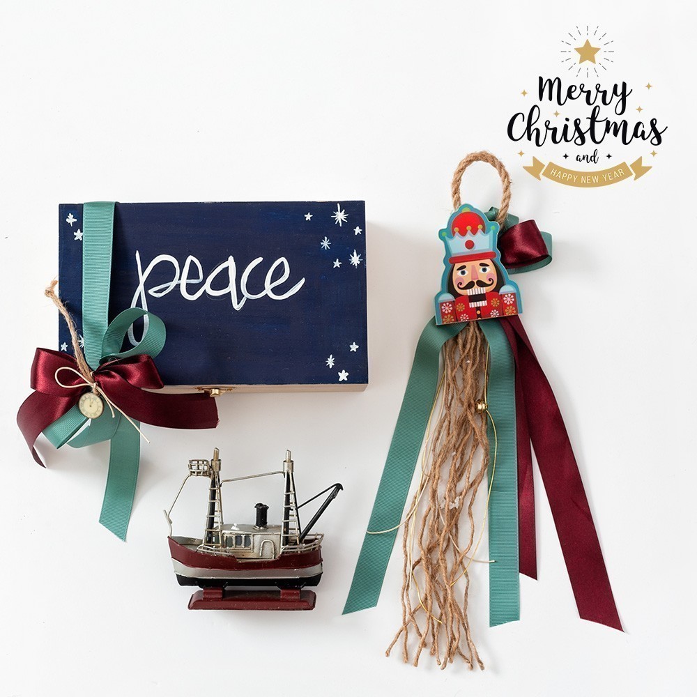 Χριστουγεννιάτικο σετ δώρου σε ξύλινο κουτί. Το καπάκι είναι ζωγραφισμένο σε μπλε χρώμα με τη φράση Peace. Μέσα περιλαμβάνει μεταλλική αντίκα καράβι και κρεμαστό με ξύλινο κοπτικό καρυοθραύστη και κορδέλες.