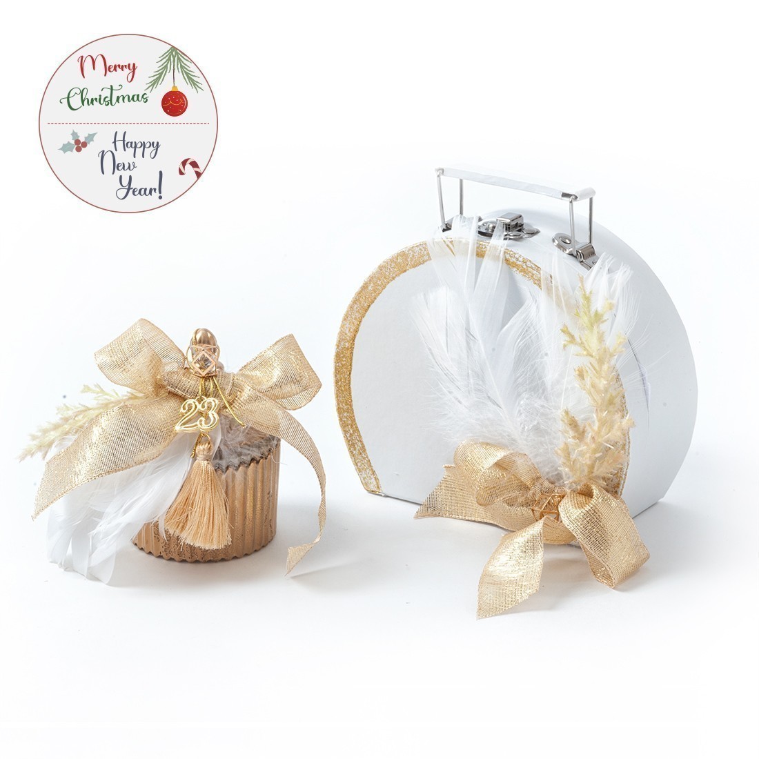 Xριστουγεννιάτικο σετ δώρου που περιλαμβάνει: α)γυάλινη φοντανιέρα στολισμένη με σύνθεση από φτερά, διαμαντάκι και μεταλλικό μοτίφ και β) χάρτινο λευκό βαλιτσάκι με χρυσά glitter σβησίματα.