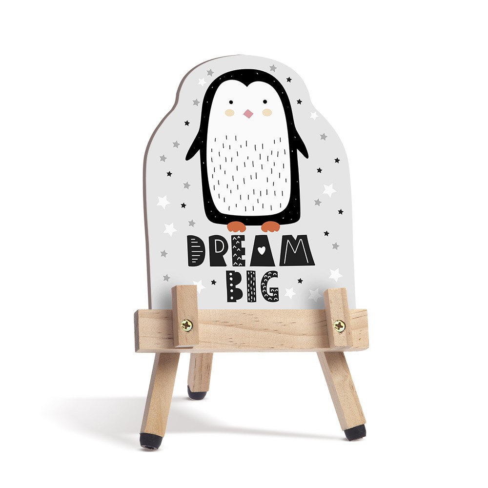 Ξύλινο καδράκι print σε καβαλέτο. Η παράσταση είναι με θέμα πιγκουίνο με μότοDream Big.