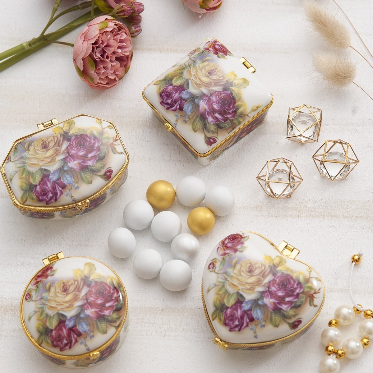 Μπιζουτιέρα από πορσελάνη διακοσμημένη με λουλούδια και με κούμπωμα σε χρυσό χρώμα,κατάλληλη και για γάμο.Η συσκευασία περιλαμβάνει 4 διαφορετικά σχήματα μπιζουτιέρας, στρογγυλό, καρδιά, τετράγωνη και ορθογώνια