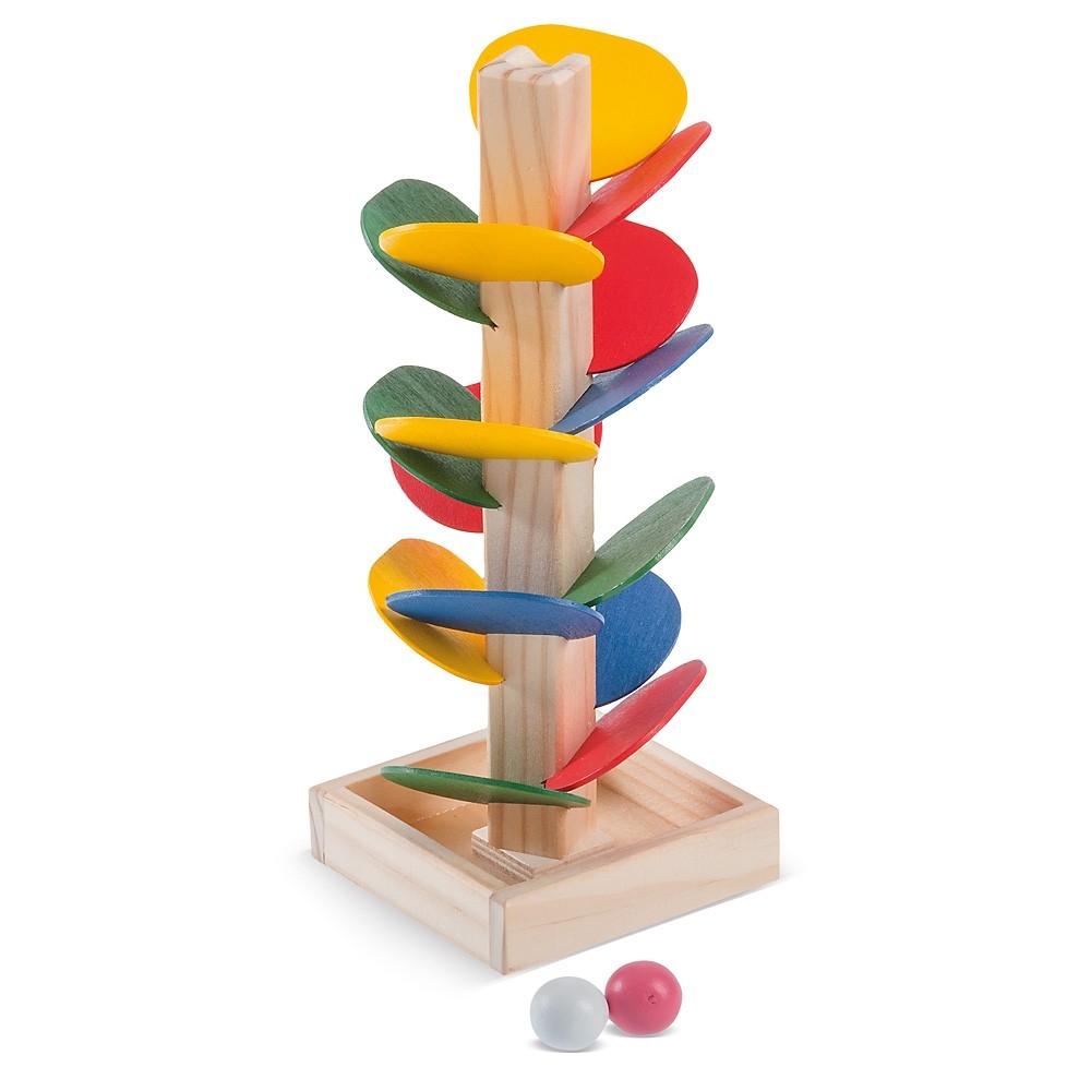 Ξύλινο παιχνίδι με μπαλάκι. Αφήνεις το μπαλάκι να κυλήσει πάνω στα φύλλα και να φτάσει κάτω στη βάση. Η συσκευασία περιλαμβάνει: 15 φύλλα ( πράσινο, κίτρινο, μπλε, κόκκινο), 1 κορμός , 1 βάση , 2 μπάλες