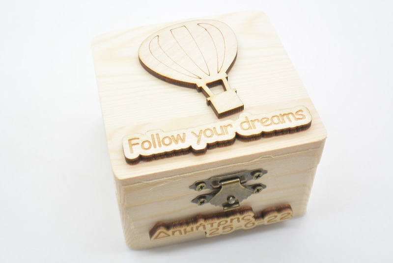 Ξύλινο κουτί μπομπονιέρα αερόστατο. Πάνω στο κουτάκι υπάρχει χαραγμένη η φράση ¨Φτάσε όπου δεν μπορείς¨ και στη βάση το όνομα του μωρού και η ημερομηνία βάπτισης. Διάσταση 8 x 8 x 5 cm.
