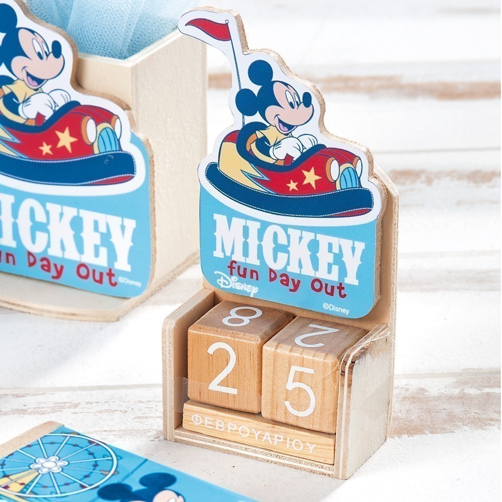 Disney ξύλινο natural ημερολόγιο με δυνατότητα αλλαγής της ημερομηνίας προσαρμόζοντας τα κυβάκια. Είναι διακοσμημένο με ξύλινη παράσταση print Mickey Fun Day σε τιρκουάζ-κόκκινες αποχρώσεις.