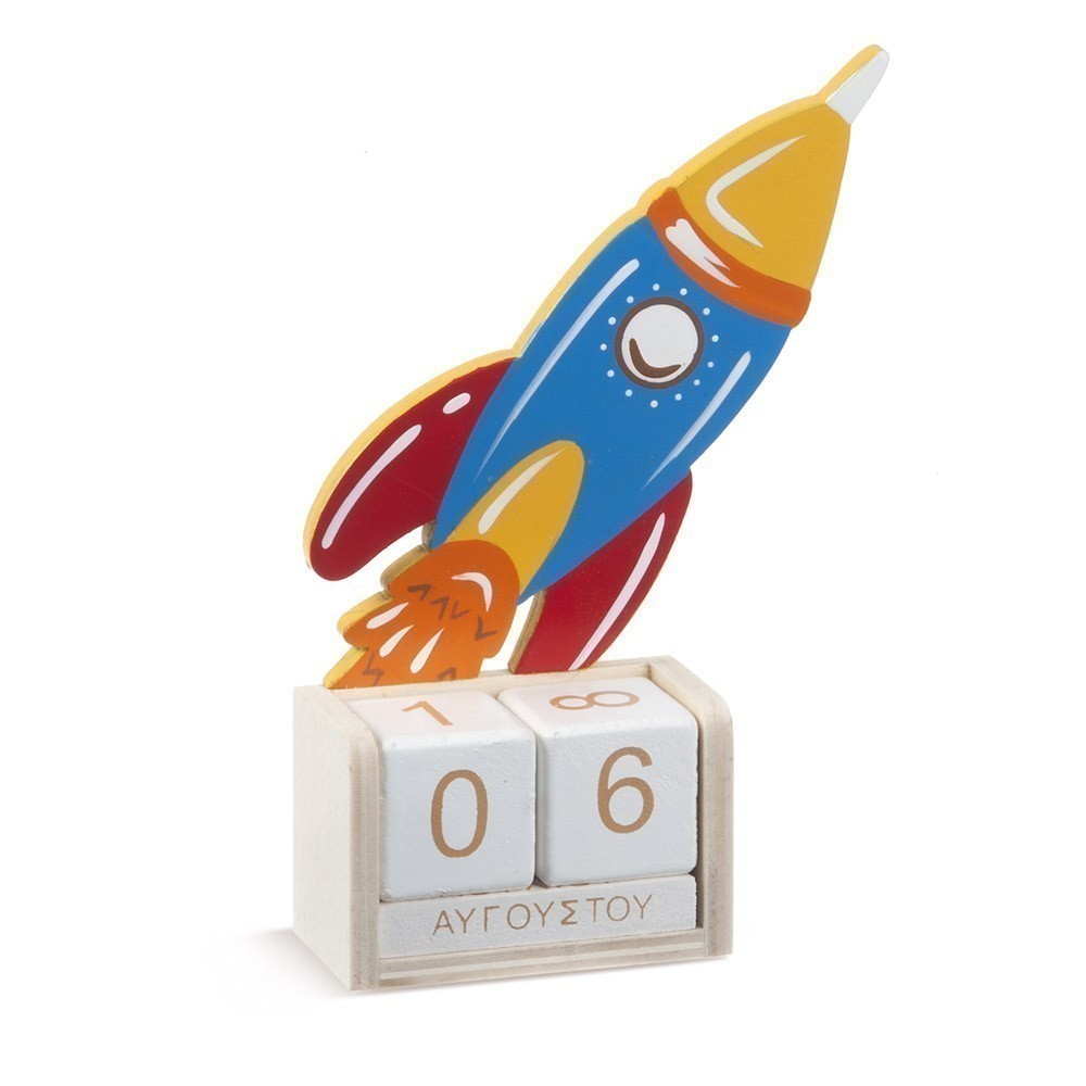 Ξύλινο natural ημερολόγιο με δυνατότητα αλλαγής της ημερομηνίας προσαρμόζοντας τα κυβάκια. Είναι διακοσμημένο με ξύλινη παράσταση πολύχρωμος πύραυλος.