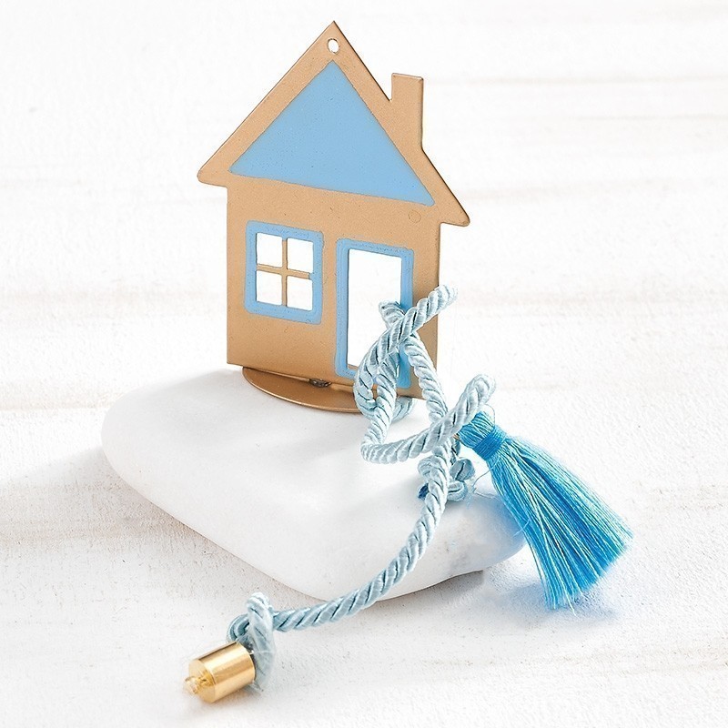 Είναι στολισμένο με χρυσό μεταλλικό σπίτι με λεπτομέρειες σιέλ,suede κορδόνι και φούντα.