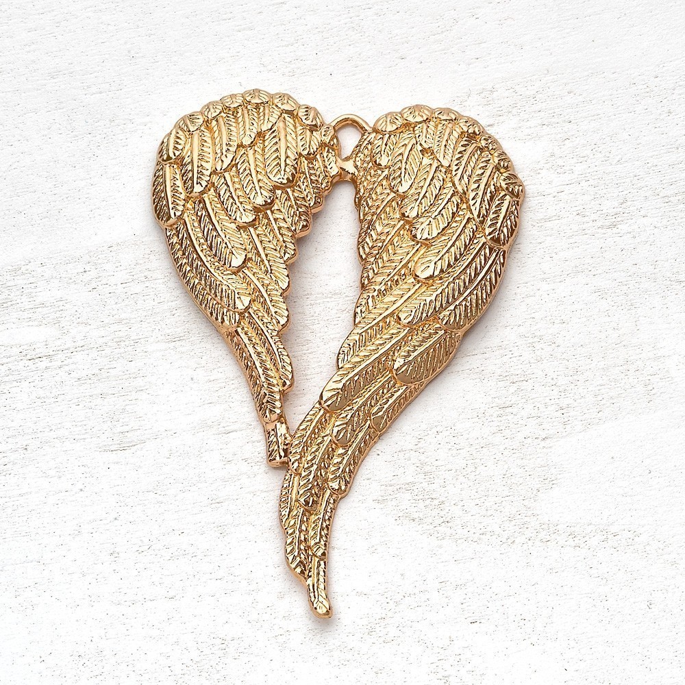 Μεταλλικό κρεμαστό διακοσμητικό διπλό φτερό σε χρώμα χρυσό. Κατάλληλο για διακοσμήσεις και χειροποίητες κατασκευές. Η συσκευασία περιέχει 10 τεμάχια.
