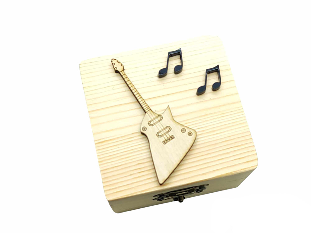 Μπομπονιέρα Ξύλινο κουτί ηλεκτρική κιθάρα με λεπτομέρειες plexiglass. Διάσταση 8 x 8 x 5 cm. Η τιμή αφορά σκέτο το αντικείμενο. Απο το υπομενού μπορείτε να επιλέξετε με επιπλέον χρέωση να γίνει δεμένη μπομπονιέρα με 5 κουφέτα αμυγδάλου ή 9 smarties.