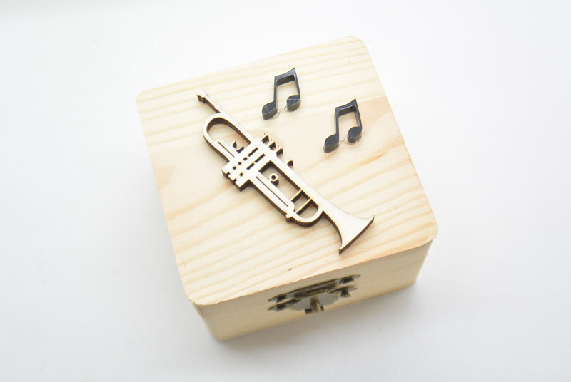 Μπομπονιέρα Ξύλινο κουτί μουσική τρομπέτα με λεπτομέρειες plexiglass. Διάσταση 8 x 8 x 5 cm. Η τιμή αφορά σκέτο το αντικείμενο. Απο το υπομενού μπορείτε να επιλέξετε με επιπλέον χρέωση να γίνει δεμένη μπομπονιέρα με 5 κουφέτα αμυγδάλου ή 9 smarties.