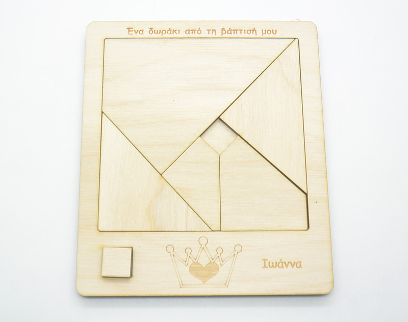 Μπομπονιέρα Ξύλινο παζλ Tangram με θέμα κορώνα στέμμα. Διάσταση 14 x 12 cm. Μπορεί να χαρακτεί όποιο θέμα θέλετε, αφιέρωση όπως και το όνομα του παιδιού σας. Έρχεται έτοιμο μέσα σε διάφανο σακουλάκι.