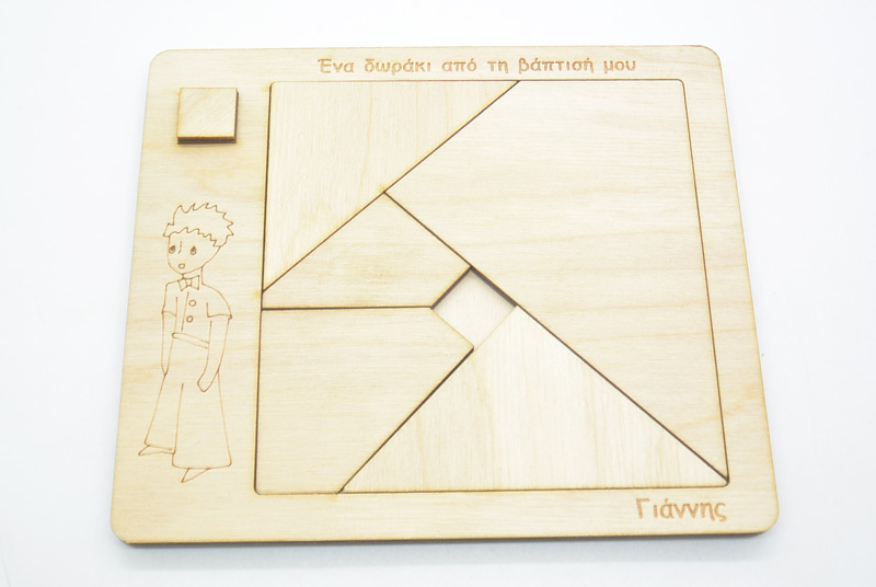 Μπομπονιέρα Ξύλινο παζλ Tangram με θέμα μικρός πρίγκιπας. Διάσταση 14 x 12 cm. Μπορεί να χαρακτεί όποιο θέμα θέλετε, αφιέρωση όπως και το όνομα του παιδιού σας. Έρχεται έτοιμο μέσα σε διάφανο σακουλάκι.