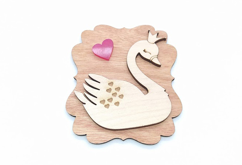 Μπομπονιέρα Βάπτισης ξύλινο μαγνητάκι κύκνος με καρδιές με διαστάσεις 8.8 x 7.4 εκ.