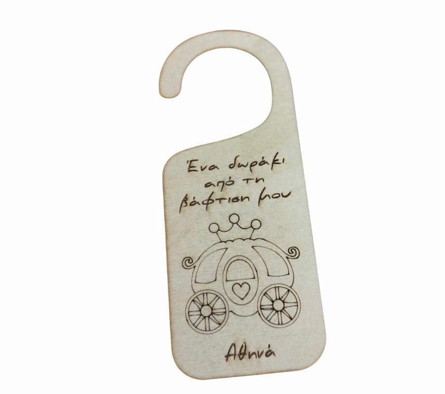 Διακοσμητικό πόρτας door hanger για μπομπονιέρα με θέμα άμαξα κολοκύθα. Διάσταση 6 x 15 εκ. Μπορεί να χαρακτεί το όνομα του μωρού.