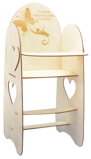 Καρεκλάκι φαγητού κούκλας με σχέδιο πεταλούδα. Διαστάσεις 55 x 26 εκ. Το όνομα μπορεί να αλλάξει όπως και το σχέδιο στην πλάτη και στο πλάι.