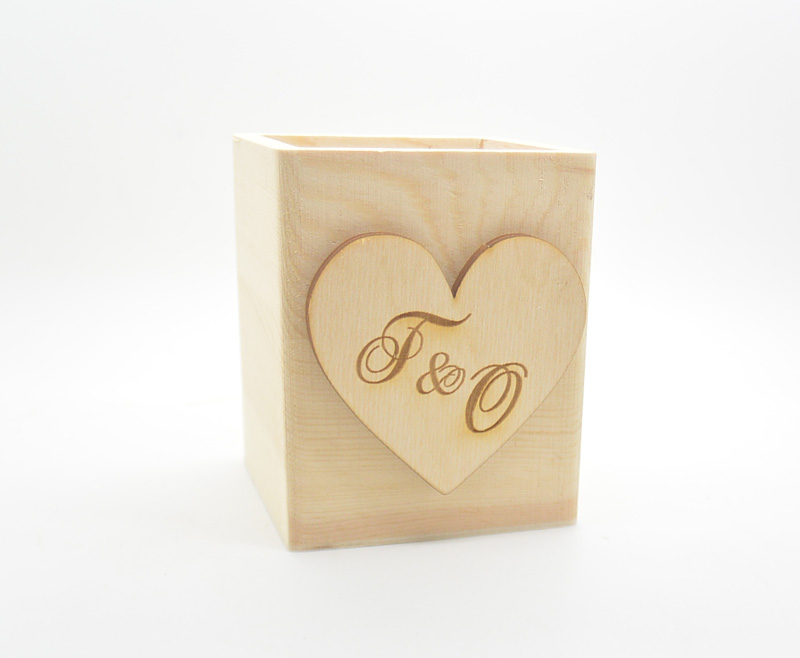 Ξύλινη Μολυβοθήκη καρδιά με μονογράμματα για διακόσμηση βάπτισης ή γάμου για μεγάλες ποσότητες ρωτήστε μας τιμή. Διάσταση 8 x 8 x 10 εκ.