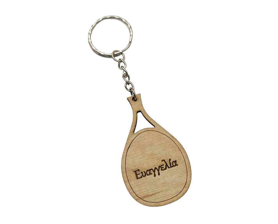 Ξύλινο Μπρελόκ ρακέτα τένις με όνομα με διάσταση μπρελόκ 12,5 εκ με τον κρίκο.