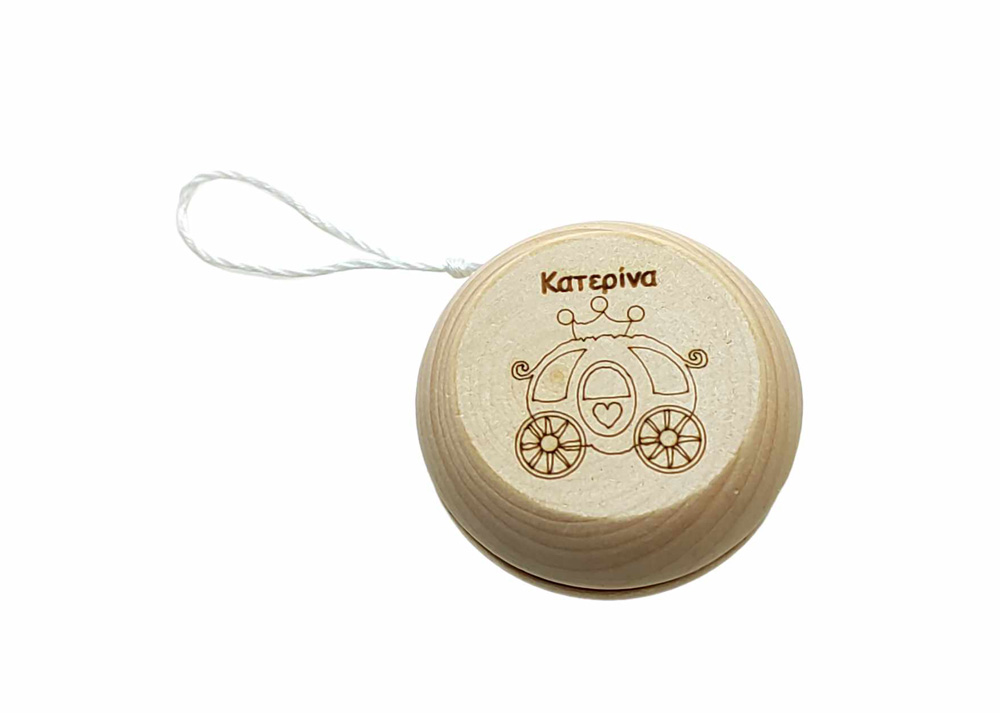 Ξύλινο ΓΙΟ ΓΙΟ άμαξα κολοκύθα με το όνομα του παιδιού σας. Μπορεί να γίνει σε ότι σχέδιο ή θέμα θέλετε. Διάμετρος 5,5 εκ.