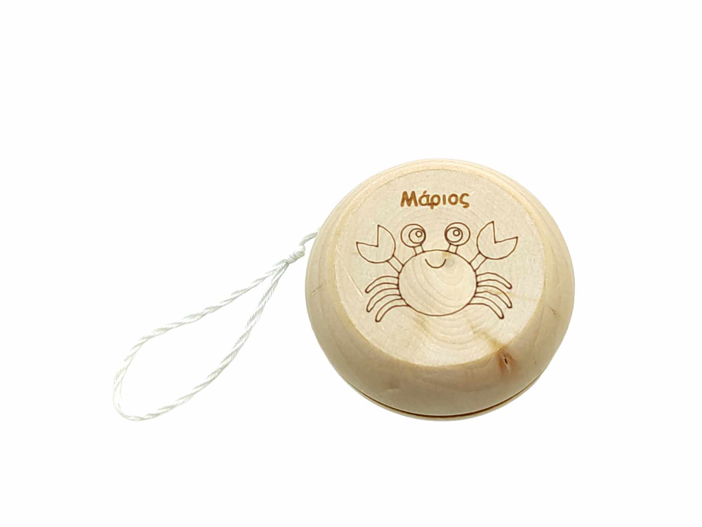 Ξύλινο ΓΙΟ ΓΙΟ καβουράκι με το όνομα του παιδιού σας. Μπορεί να γίνει σε ότι σχέδιο ή θέμα θέλετε. Διάμετρος 5,5 εκ.