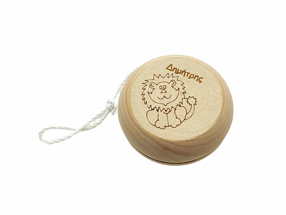 Ξύλινο ΓΙΟ ΓΙΟ λιοντάρι με το όνομα του παιδιού σας. Μπορεί να γίνει σε ότι σχέδιο ή θέμα θέλετε. Διάμετρος 5,5 εκ.