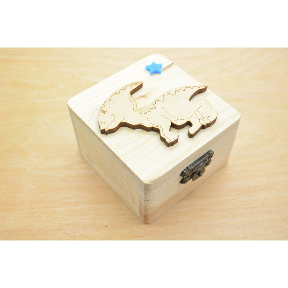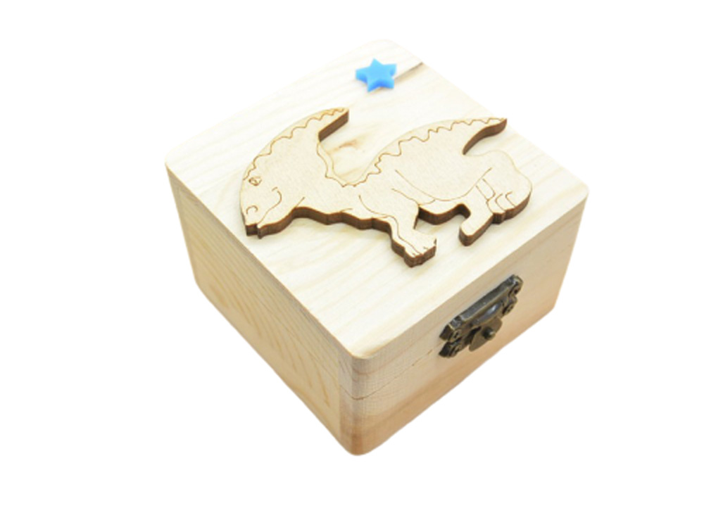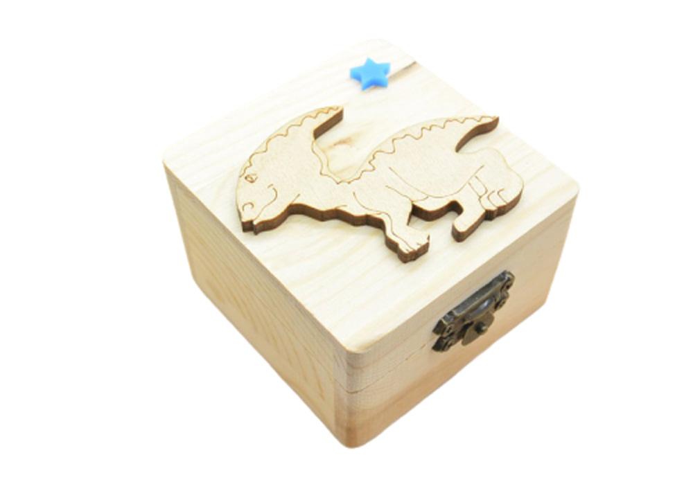 Ξύλινο κουτί δεινοσαυράκι με λεπτομέρειες plexiglass μπορείτε να επιλέξετε το χρώμα στις λεπτομέρειες plexiglass. Διάσταση κουτί 8 x 8 x 5 cm.