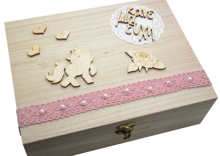 Ξύλινο Κουτί ευχών βάπτισης με θέμα μονόκερος. Διαστάσεις κουτιού 32 x 25 x 11 εκ. Μπορεί να συνδιαστεί με ξύλινες καρδιές με επιπλέον χρέωση.
