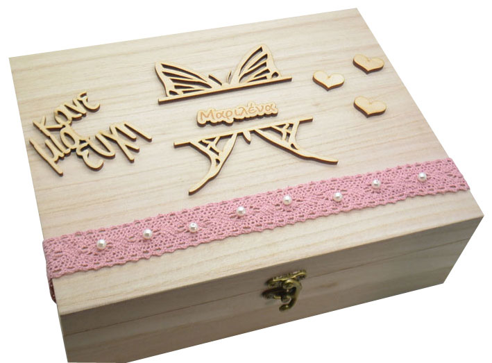 Ξύλινο Κουτί ευχών βάπτισης με θέμα πεταλούδα με καρδιές. Διαστάσεις κουτιού 32 x 25 x 11 εκ. Μπορεί να συνδιαστεί με ξύλινες καρδιές με επιπλέον χρέωση.