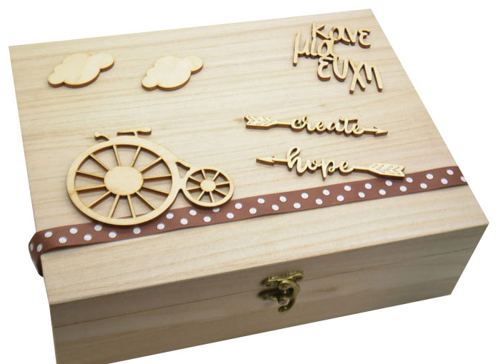 Ξύλινο Κουτί ευχών βάπτισης με θέμα ποδήλατο. Διαστάσεις κουτιού 32 x 25 x 11 εκ. Μπορεί να συνδιαστεί με ξύλινες καρδιές με επιπλέον χρέωση.
