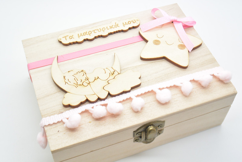 Ξύλινο Κουτί μαρτυρικών με θέμα αστεράκι. Διαστάσεις εξωτερικές κουτιού Υ:8 x Π:20 x Μ:16 εκ. Μπορούν να αλλάξουν οι κορδέλες σε ότι χρώμα θέλετε.