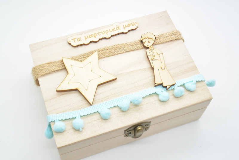 Ξύλινο Κουτί μαρτυρικών με θέμα μικρός πρίγκιπας. Διαστάσεις εξωτερικές κουτιού Υ:8 x Π:20 x Μ:16 εκ. Μπορούν να αλλάξουν οι κορδέλες σε ότι χρώμα θέλετε.
