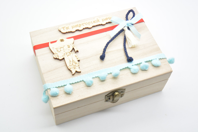 Ξύλινο Κουτί μαρτυρικών με θέμα πειρατής. Διαστάσεις εξωτερικές κουτιού Υ:8 x Π:20 x Μ:16 εκ. Μπορούν να αλλάξουν οι κορδέλες σε ότι χρώμα θέλετε.