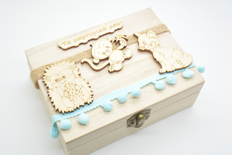 Ξύλινο Κουτί μαρτυρικών με θέμα ζωάκια του δάσους. Διαστάσεις εξωτερικές κουτιού Υ:8 x Π:20 x Μ:16 εκ. Μπορούν να αλλάξουν οι κορδέλες σε ότι χρώμα θέλετε.