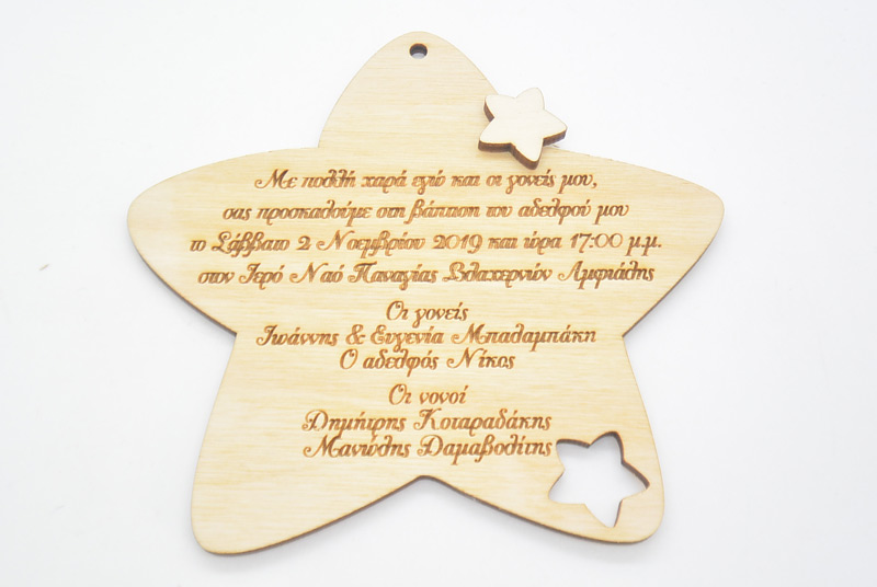 Ξύλινο Προσκλητήριο με θέμα αστέρι. Διάσταση προσκλητηρίου 13 x 12 εκ.