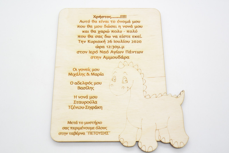 Ξύλινο Προσκλητήριο με θέμα δεινοσαυράκι. Διάσταση προσκλητηρίου 14 x 12 εκ.