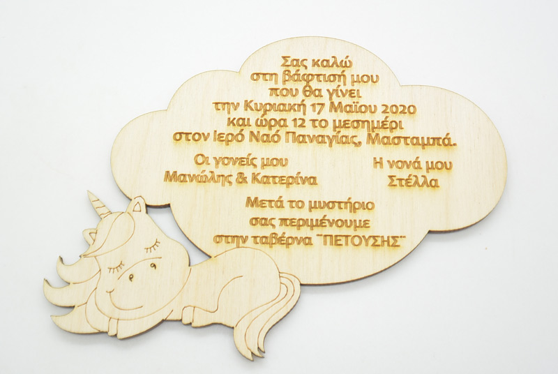 Ξύλινο Προσκλητήριο με θέμα μονόκερος. Διάσταση προσκλητηρίου 14 x 10,6 εκ.