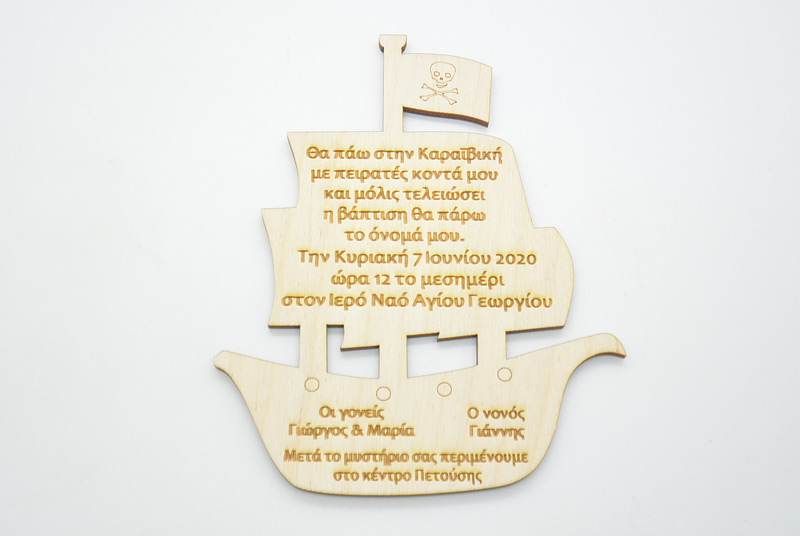 Ξύλινο Προσκλητήριο με θέμα πειρατικό καράβι. Διάσταση προσκλητηρίου 13 x 11,5 εκ.