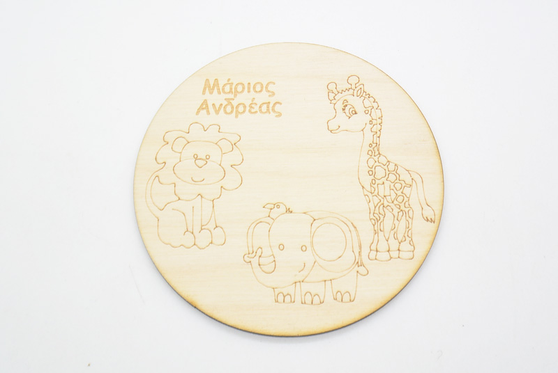 Ξύλινο Σουβέρ βάπτισης ζωάκια της ζούγκλας με το όνομα του παιδιού σας. Διάσταση 11 εκ. Μπορεί να γίνει με θέμα της επιλογής σας.