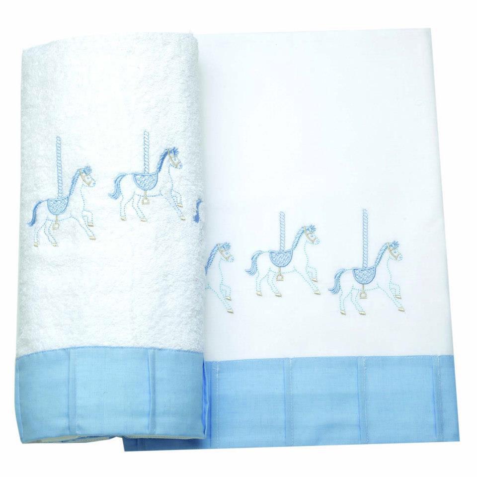 Λαδόπανα Βάπτισης με θέμα καρουζέλ αλογάκια ελληνικής κατασκευής άριστης ποιότητας βαμβακερά σε 3 αποχρώσεις. Το σετ περιλαμβάνει πετσέτα μικρή και μεγάλη, σεντονάκι και σετ εσώρουχα.