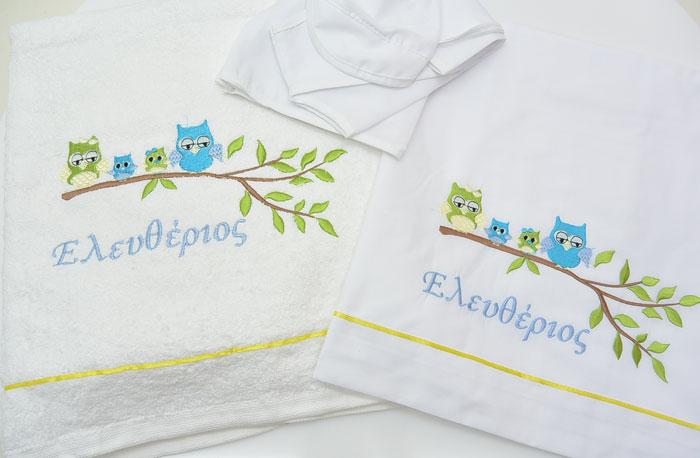 Λαδόπανα Βάπτισης με θέμα κουκουβάγια ελληνικής κατασκευής άριστης ποιότητας βαμβακερά. Το σετ περιλαμβάνει πετσέτα μικρή και μεγάλη, σεντονάκι και σετ εσώρουχα.
