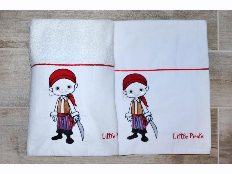 Λαδόπανα Βάπτισης με θέμα πειρατής ελληνικής κατασκευής άριστης ποιότητας βαμβακερά. Το σετ περιλαμβάνει πετσέτα μικρή και μεγάλη, σεντονάκι και σετ εσώρουχα.