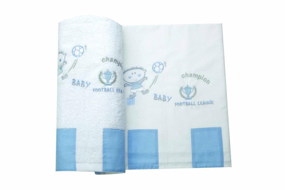 Λαδόπανα Βάπτισης με θέμα ποδοσφαιριστής ελληνικής κατασκευής άριστης ποιότητας βαμβακερά. Το σετ περιλαμβάνει πετσέτα μικρή και μεγάλη, σεντονάκι και σετ εσώρουχα.