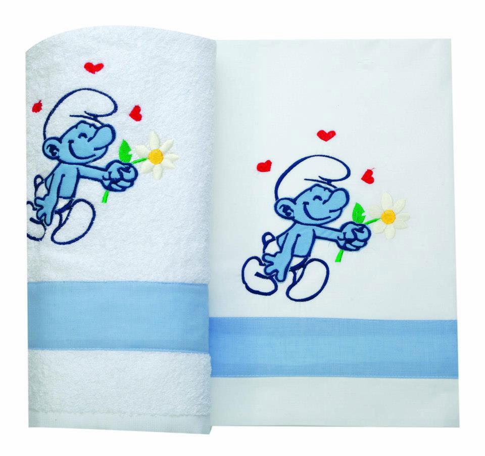Λαδόπανα Βάπτισης με θέμα στρουμφάκι ελληνικής κατασκευής άριστης ποιότητας βαμβακερά. Το σετ περιλαμβάνει πετσέτα μικρή και μεγάλη, σεντονάκι και σετ εσώρουχα.