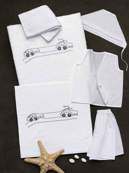 Λαδόπανα ελληνικής κατασκευής άριστης ποιότητας σε απόχρωση λευκό - navy. Το σετ περιλαμβάνει πετσέτα μικρή και μεγάλη, σεντονάκι και σετ εσώρουχα.