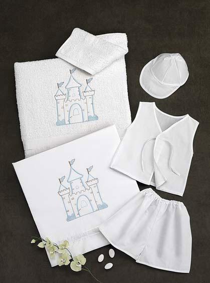 Λαδόπανα ελληνικής κατασκευής άριστης ποιότητας σε σιέλ απόχρωση με θέμα κάστρο. Το σετ περιλαμβάνει πετσέτα μικρή και μεγάλη, σεντονάκι και σετ εσώρουχα.