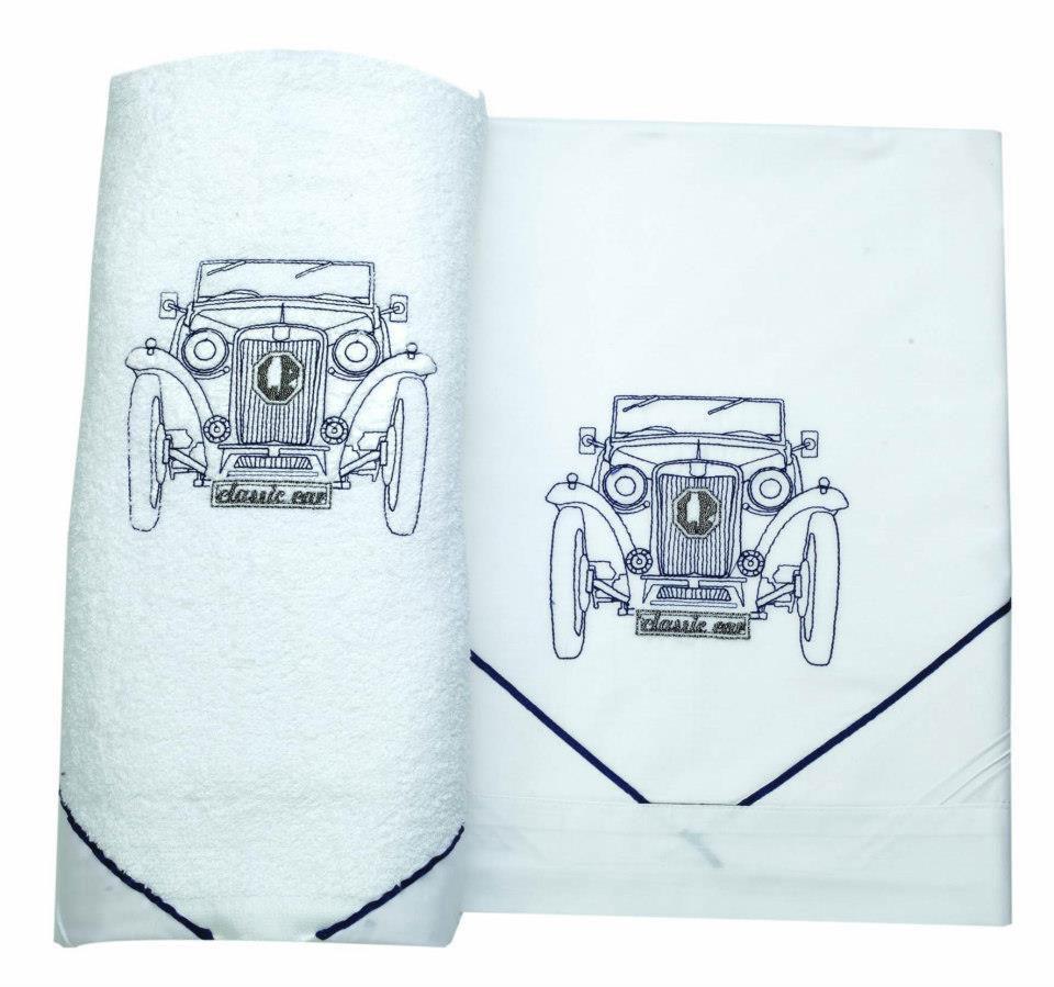 Λαδόπανα Βάπτισης με θέμα αυτοκίνητο αντίκα ελληνικής κατασκευής άριστης ποιότητας βαμβακερά. Το σετ περιλαμβάνει πετσέτα μικρή και μεγάλη, σεντονάκι και σετ εσώρουχα.