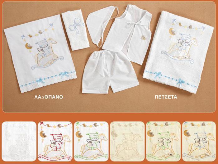 Λαδόπανα με σχέδιο αλογάκι ελληνικής κατασκευής άριστης ποιότητας σε διάφορες αποχρώσεις. Το σετ περιλαμβάνει πετσέτα μικρή και μεγάλη, σεντονάκι και σετ εσώρουχα.