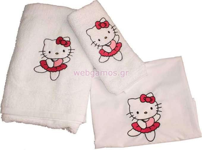 Λαδόπανα ελληνικής κατασκευής άριστης ποιότητας κεντημένα με την hello kitty. Το σετ περιλαμβάνει πετσέτα μικρή και μεγάλη, σεντονάκι και σετ εσώρουχα.