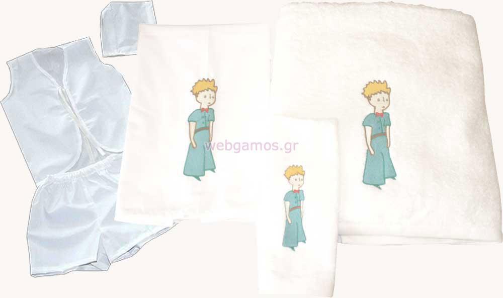Λαδόπανα ελληνικής κατασκευής άριστης ποιότητας κεντημένα με τον μικρό πρίγκιπα. Το σετ περιλαμβάνει πετσέτα μικρή και μεγάλη, σεντονάκι και σετ εσώρουχα.